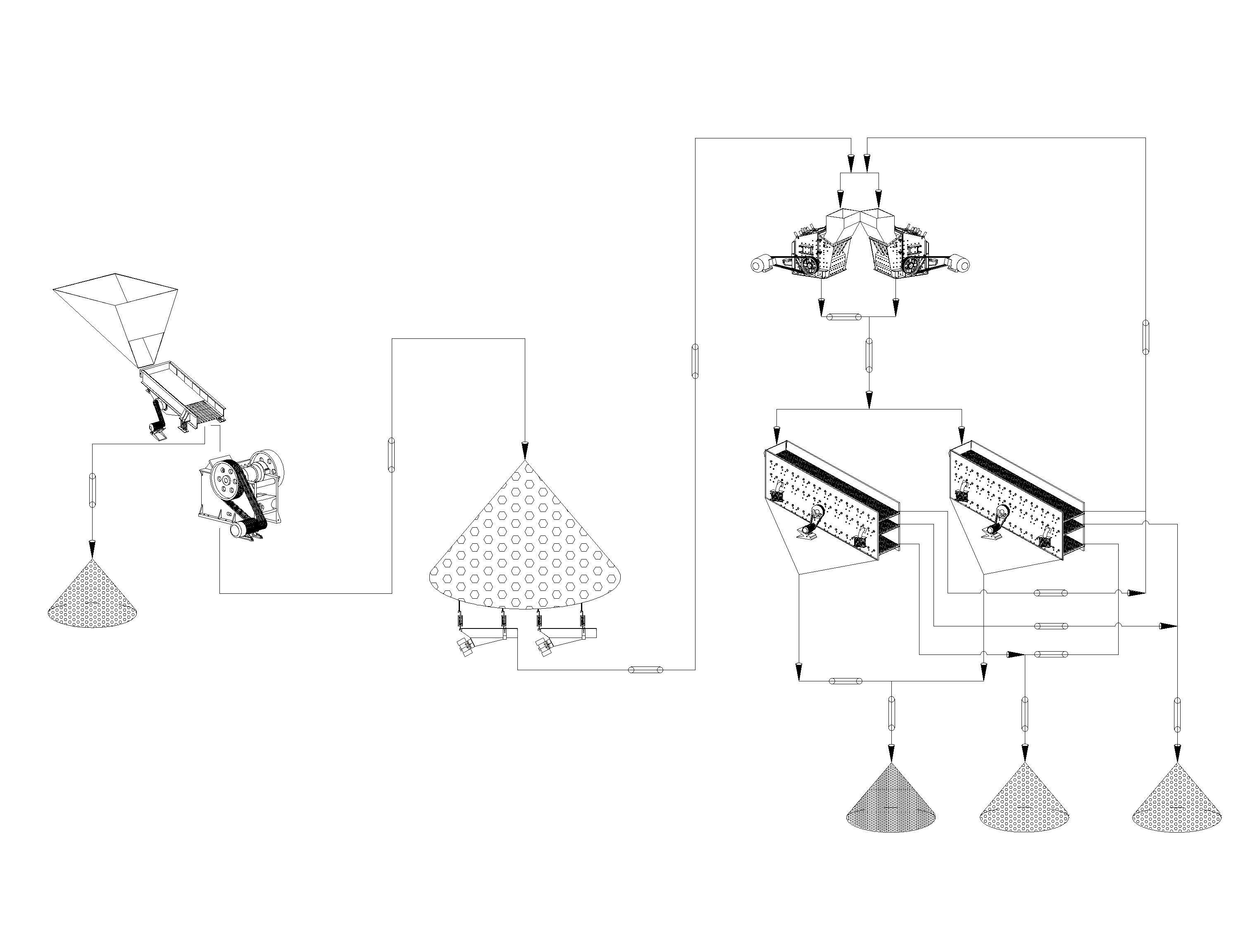 首先开采的鹅卵石通过振动筛进行筛分,将细小的符合要求的通过洗砂机直接制成成品料、不满足粒度要求的先通过颚式破碎机进行一级破碎,然后通过皮带机送入到圆锥破中进行二级破碎,破碎后的物料再次通过振动筛进行筛分,符合要求的通过洗砂机进行洗砂,不符合的物料通过皮带机送入到鹅卵石九游老哥J9俱乐部官网中进行制砂、整形。再由振动筛进行筛分,降符合要求粒度大小的物料进行洗砂,不符合要求的物料再次通过鹅卵石九游老哥J9俱乐部官网进行循环破碎,终得到成品物料。
