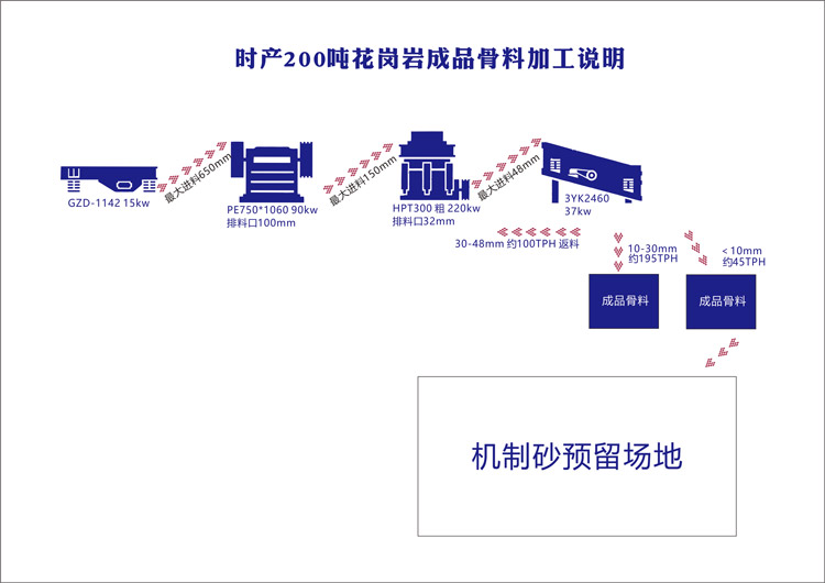 一条时产200吨左右的花岗岩破碎生产线需要哪些破碎机设备呢?由于花岗岩石料硬度较高,恒联重工机械为客户选型设备依次是 给料机、鄂破、圆锥破碎机、振动筛。